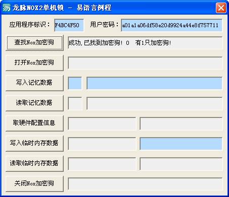 对于NOX2型有读写操作函数,其记忆内存有4个区,每个区64字节可读写,大大方便了编程人员。有时可以用此功能进行一些数据的记录,如使用次数的记录,或重要标记、重要数据的记录等操作。加密狗应用程序是通过对API 的调用实现的,NOX2 应用程序 API 的调用是有顺序的,软件厂商在软件中使用时应遵循该规则。
